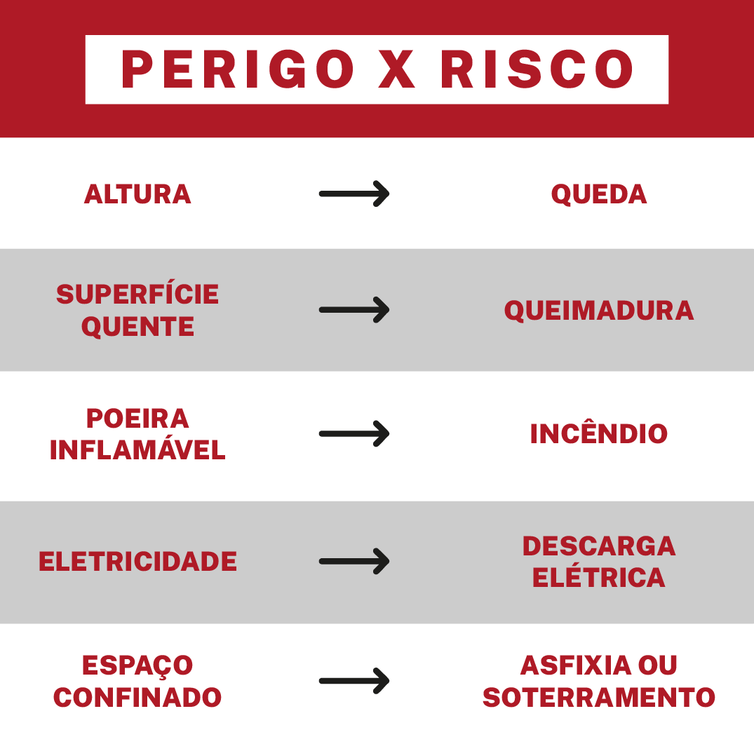 “Risco” surge a partir da exposição não controlada ao perigo detectado, ou seja, quando há contato ou interação sem medidas adequadas de prevenção e controle, criando uma situação insegura. Confira a seguir alguns exemplos:
